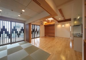 ホーム> ながとろがつくる家> 楽> 江南市H様邸 楽江南市H様邸 夫婦と子供2人 格子戸は鍵付きで、網戸にしたままでかけられる。 全天候型ランドリールーム、2階ホールとつながる吹抜け天井。 下の写真をクリックすると拡大画像がご覧いただけます。